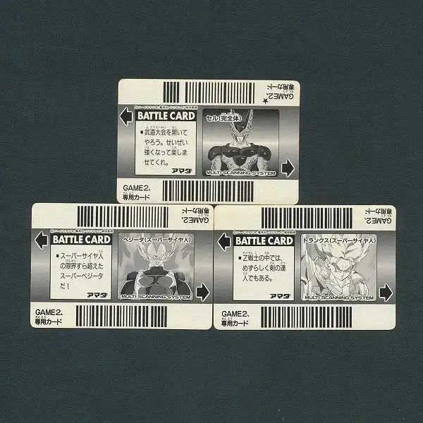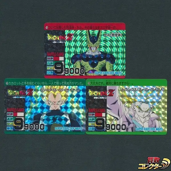 ドラゴンボールカードダス アマダ製 スーパーバーコードウォーズから、「No.18 セル(完全体)」 「No.26 ベジータ(スーパーサイヤ人)」 「No.28 トランクス(スーパーサイヤ人)」のキラカード計3枚です。