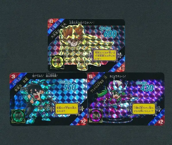 聖闘士星矢 セイントパラダイス カードダスから、「NO.43 天馬星座 星夜」「NO.3 龍星座 紫龍」「NO.5 アンドロメダ星座 瞬」のプリズムカード3枚です。