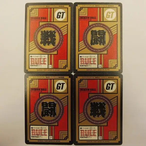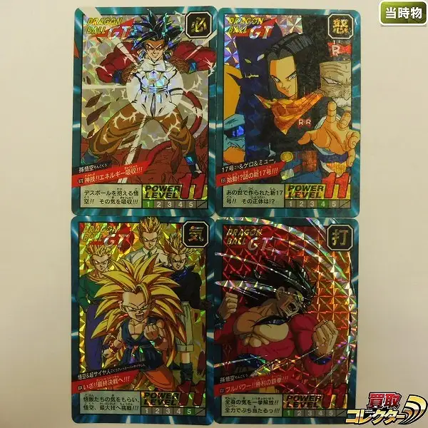 ドラゴンボールGTスーパーバトルより、「804 悟空&超サイヤ人」「837 孫悟空」「859 17号&ゲロ&ミュー」「870 孫悟空」キラカード計4枚です。
