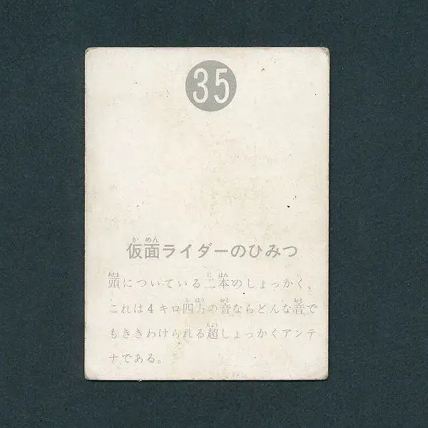 旧仮面ライダーカードから、「NO35 仮面ライダーのひみつ(表14局版)」です。