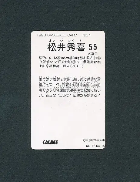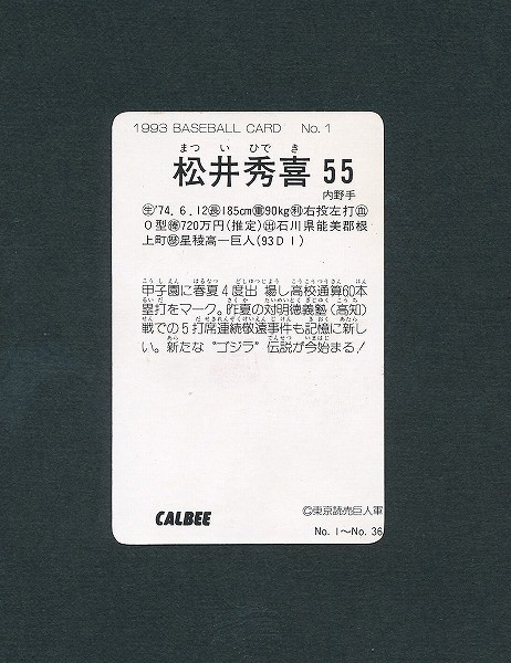 プロ野球チップス ベースボールカード1993「No.1 松井秀喜 55」です。