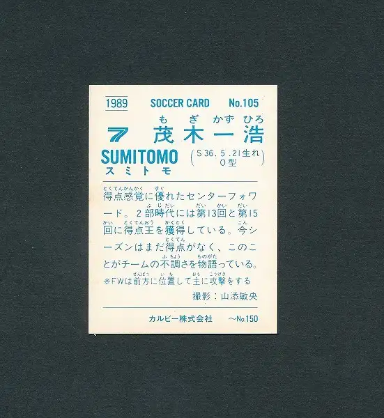日本リーグ サッカーカード89年版「No.105 茂木一浩(住金)」です。