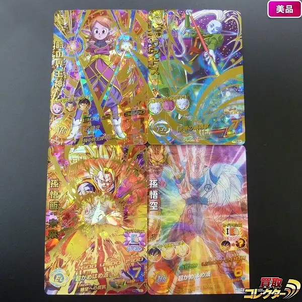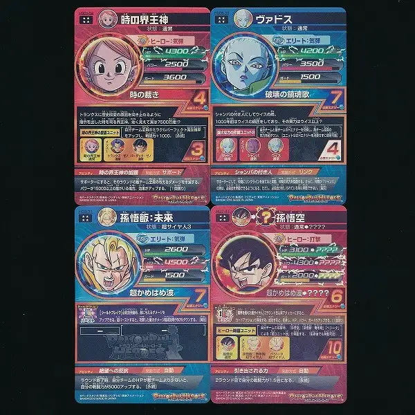 ドラゴンボールヒーローズから、「時の界王神(HGD3-58)」「ヴァドス(HGD8-39)」「孫悟飯:未来(HG9-31)」「孫悟空(HG7-41)」の4枚です。
