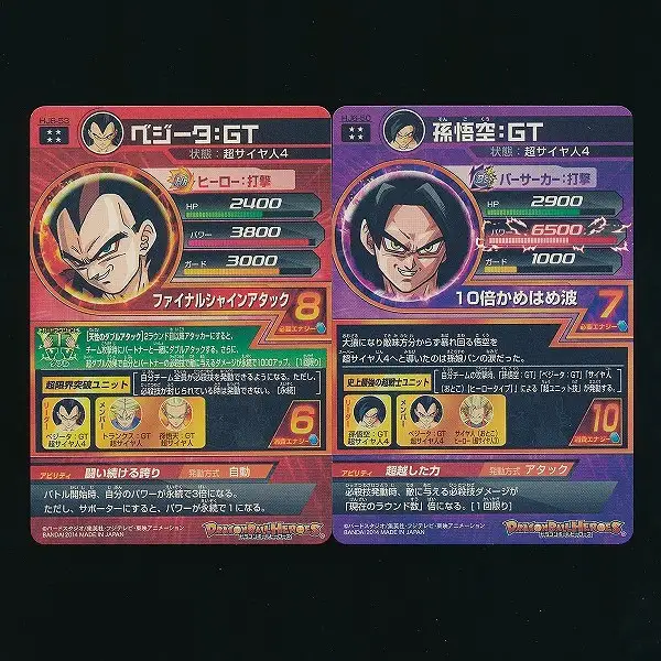 ドラゴンボールヒーローズから、「ベジータ:GT(HJ6-53)」「孫悟空:GT(HJ6-50)」の2枚です。