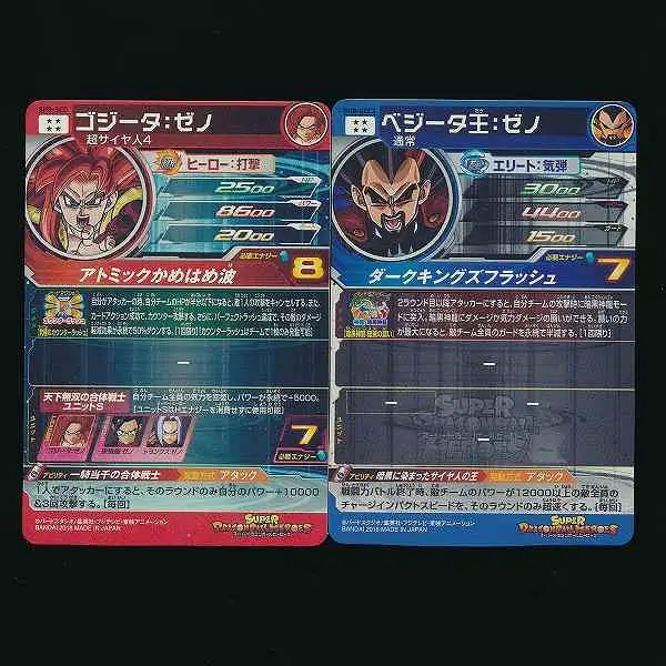 スーパードラゴンボールヒーローズから、「ゴジータ:ゼノ(SH8-SEC)」「ベジータ王:ゼノ(SH8-SEC2)」の2枚です。