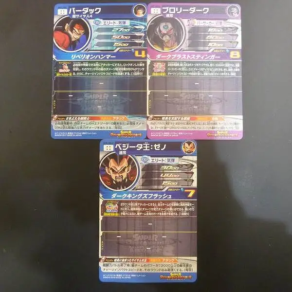 スーパードラゴンボールヒーローズから、「バーダック(SH7-SEC)」「ブロリーダーク(SH7-SEC2)」「ベジータ王:ゼノ(SH8-SEC2)」です。