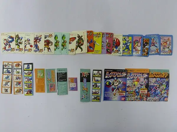 ロックマンセレクトシリーズ等の消しゴム人形とカードやシール、箱の切り抜き等大量です。