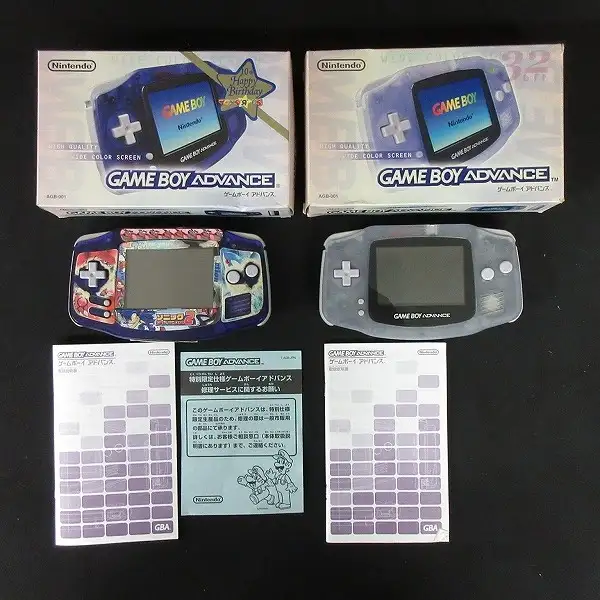 ゲームボーイアドバンスにはすべて取扱説明書がございます。ゲームボーイアドバンスのトイザラス限定バージョンは、多数のシールが貼られています。また、電池蓋の一部が破損しています。