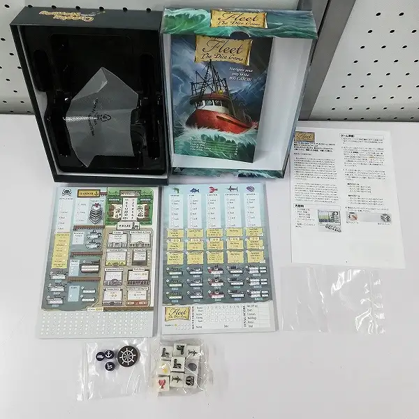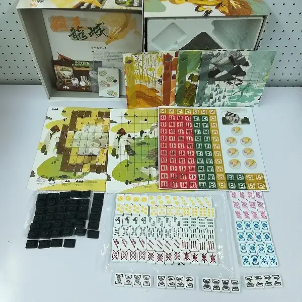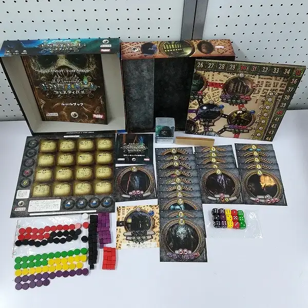 一部付属ダイスが内袋未開封のもの、カードを収めているシュリンクが未開封のもの、タイルが未切のものがあります。